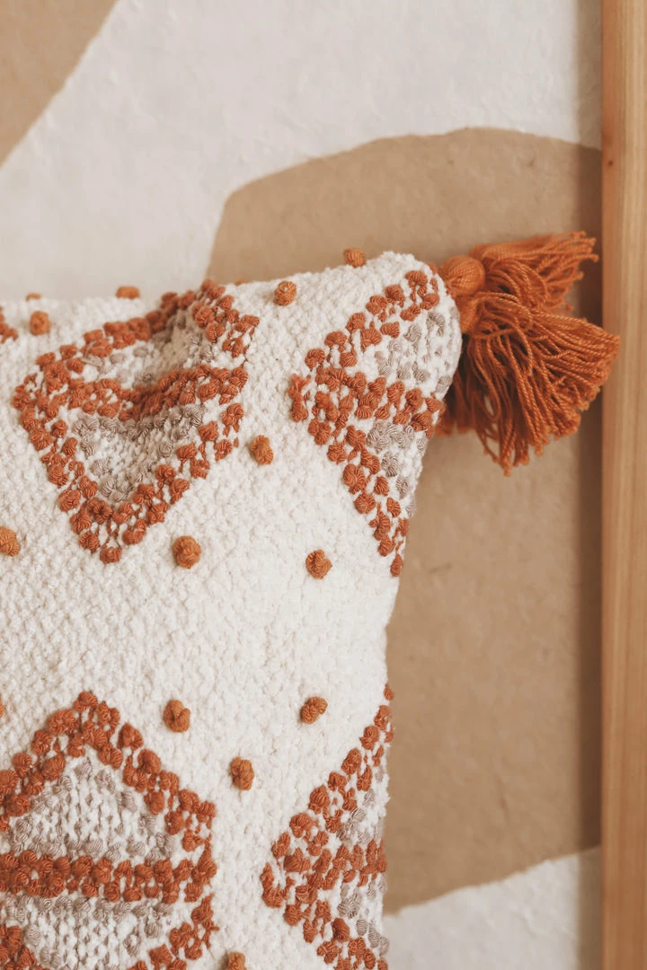 · ivory pillow with warm neutral and rust embroidered accents
