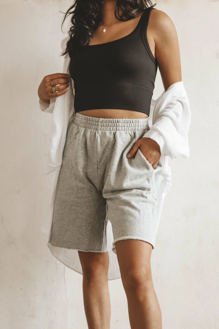 · style tip: contrast relaxed shorts with a form fitting tank and lightweight and flowy outer- layer