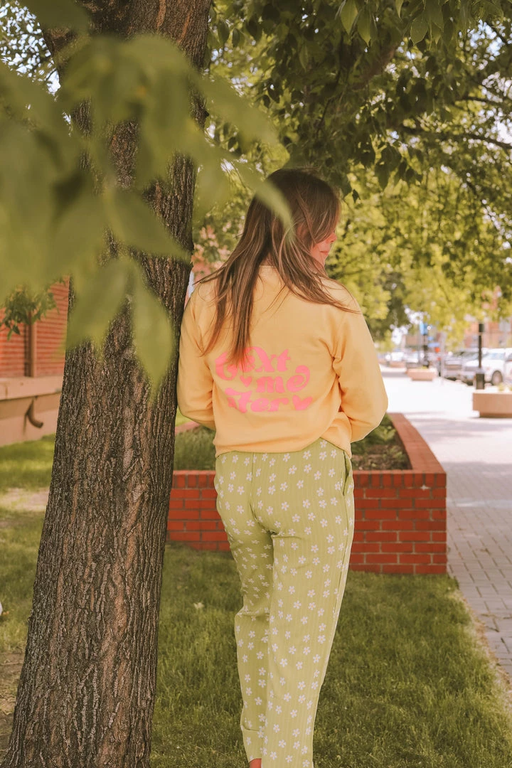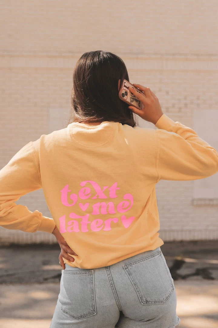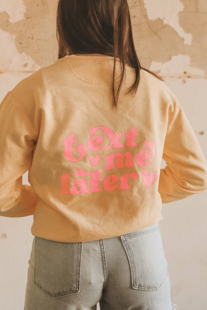 · “text me later” pink printed design on back w/ two hearts