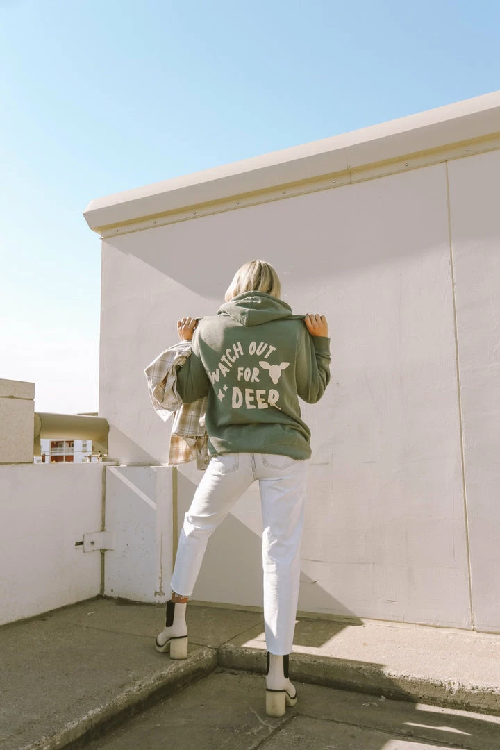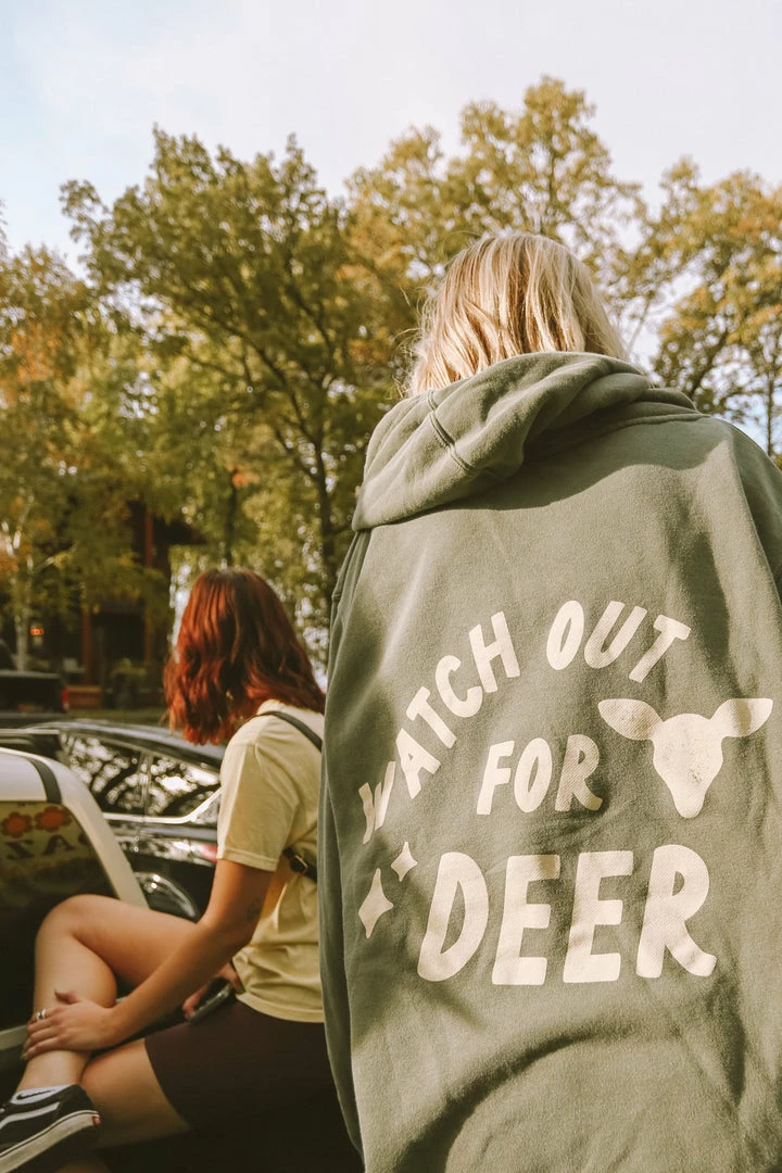· “watch out for deer” screen printed design on back