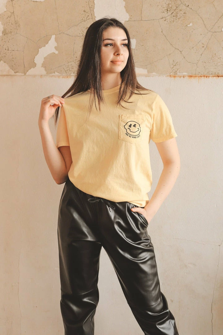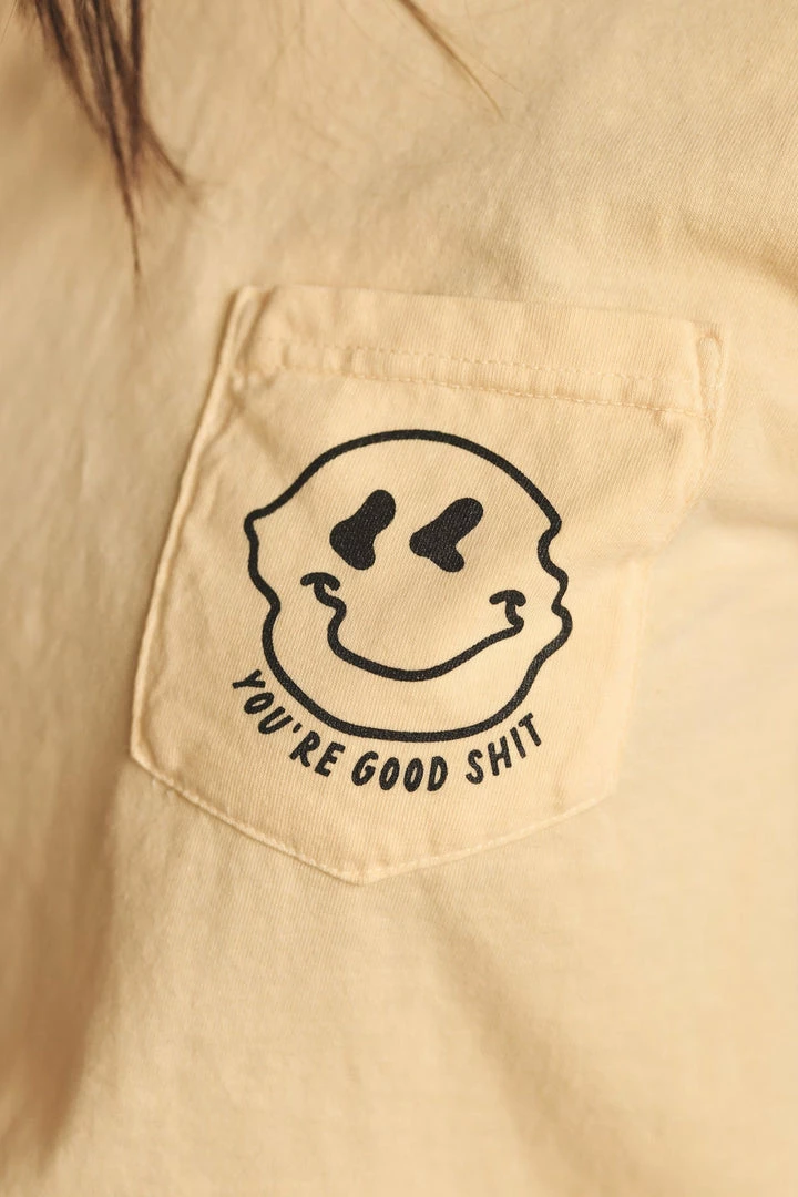 路 “you’re good shit” printed design w/聽squiggle smiley face on pocket