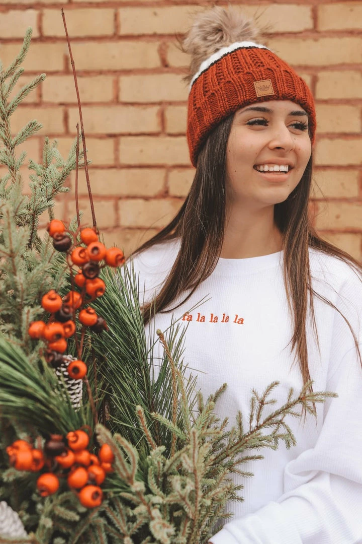 · red embroidered “fa la la la la”