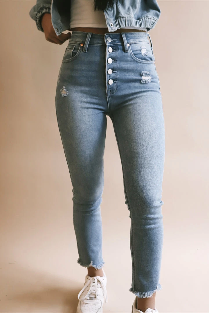 · slightly cropped ankle with raw hem and slight distressing
