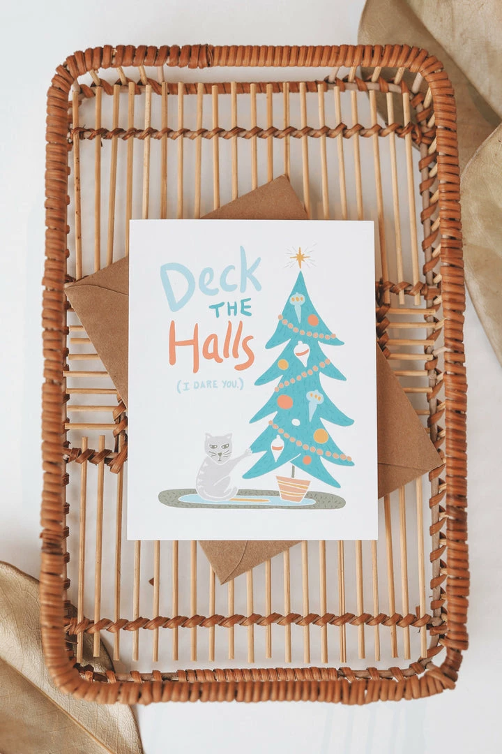 路 “deck the halls, I dare you” text with cat + christmas tree graphic
