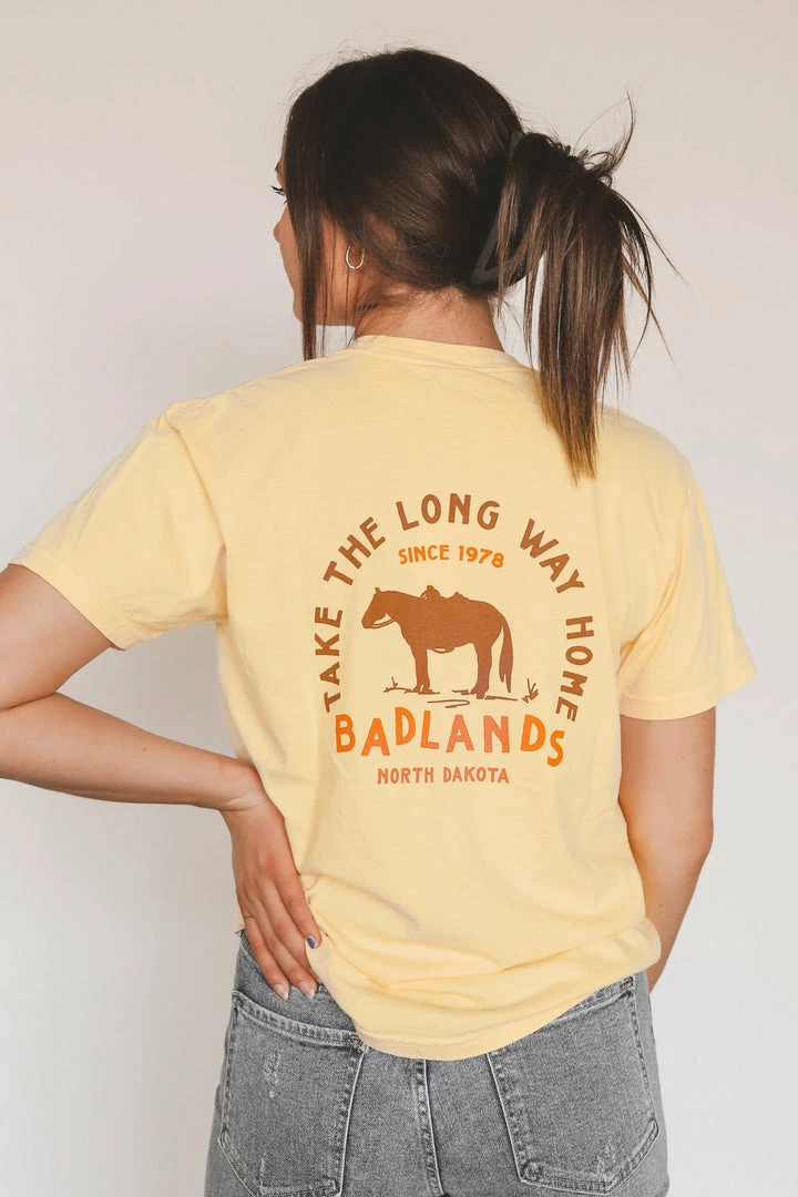 · “take the long way home – badlands, north dakota – since 1978” text on back