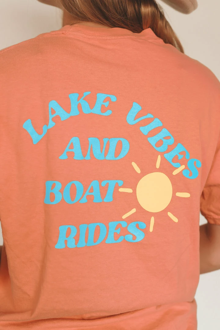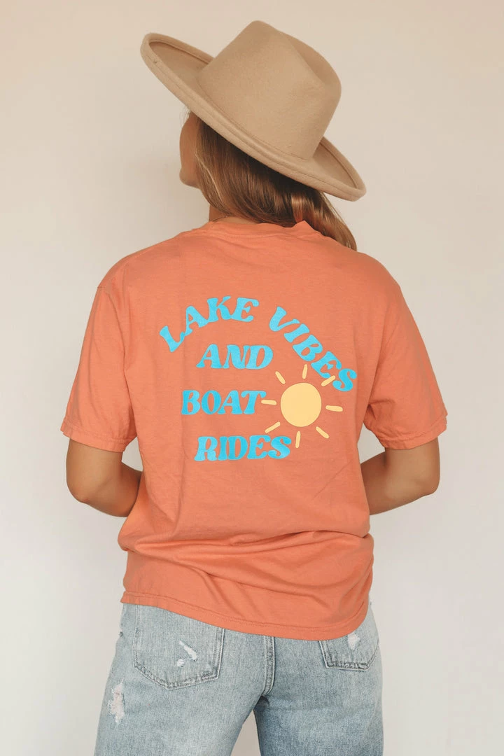 · summer inspired “lake vibes and boat rides” printed graphic on back