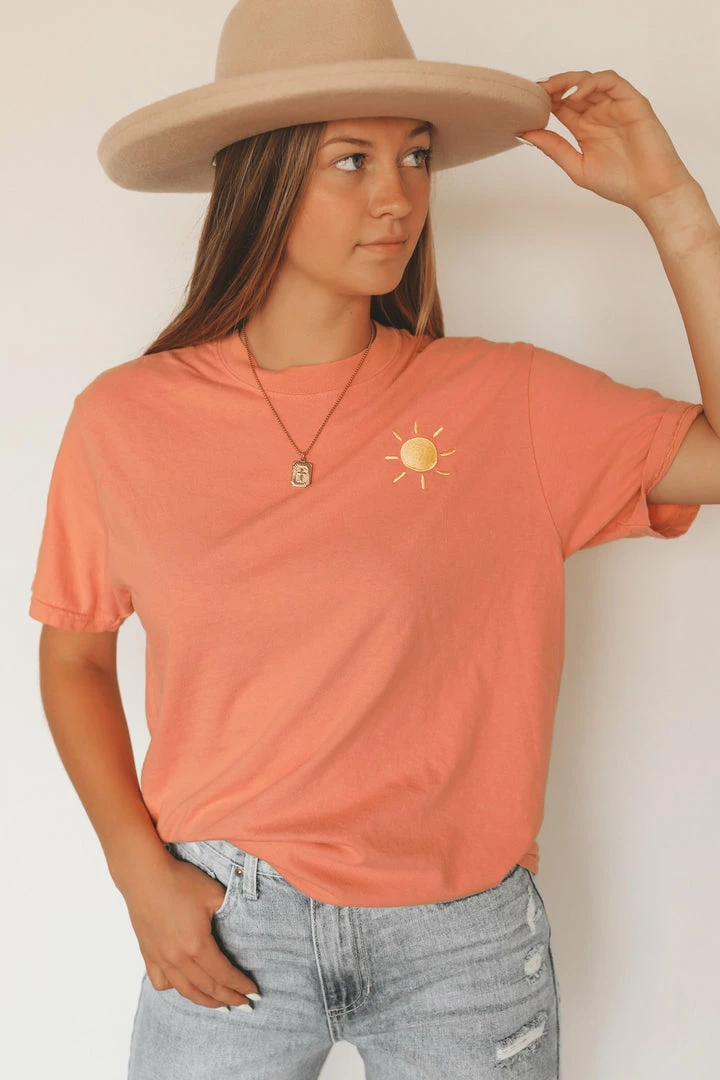· embroidered sun on left chest in front