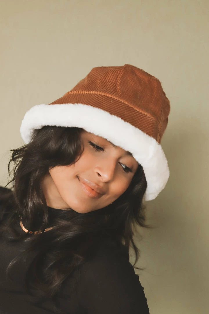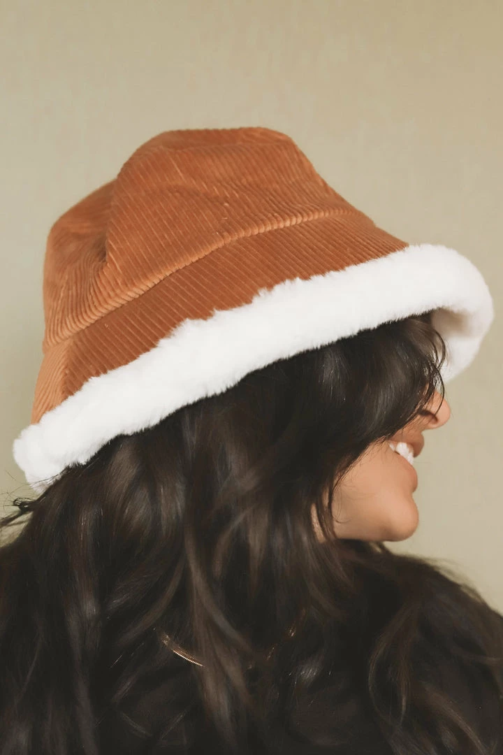 路 camel聽corduroy bucket hat with white fur trim