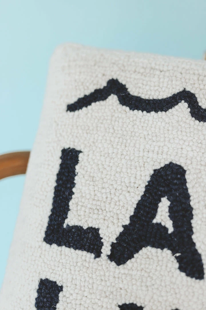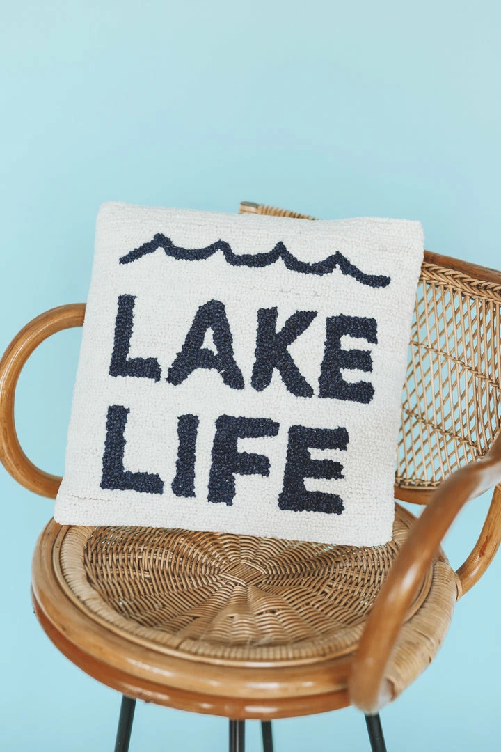 · hooked square accent pillow with lake life block lettering