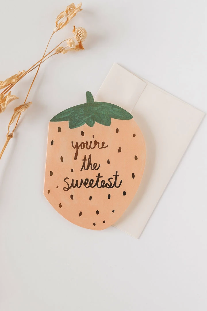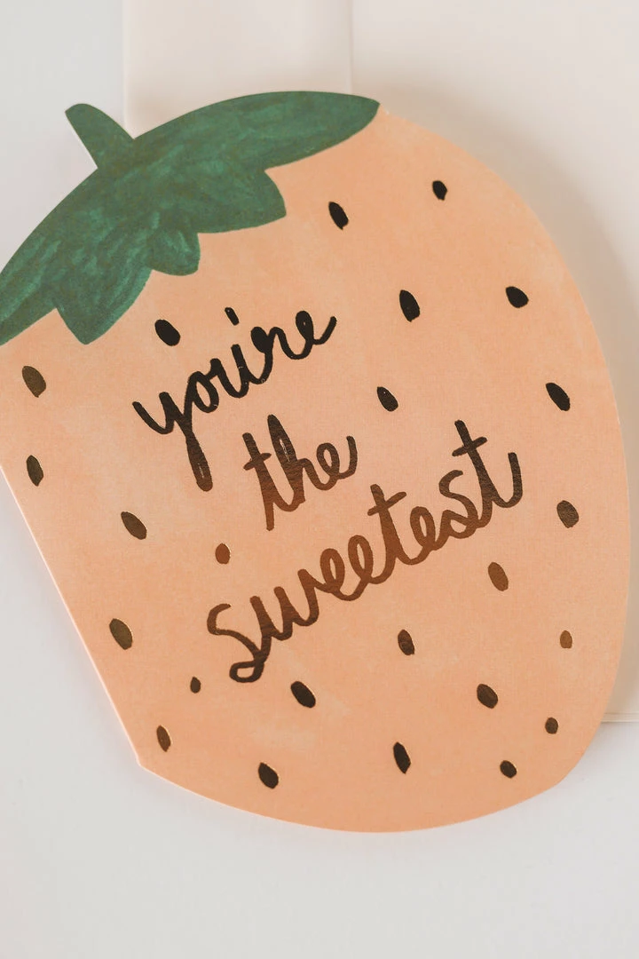 · washed strawberry paper cutout with metallic “you’re the sweetest” script