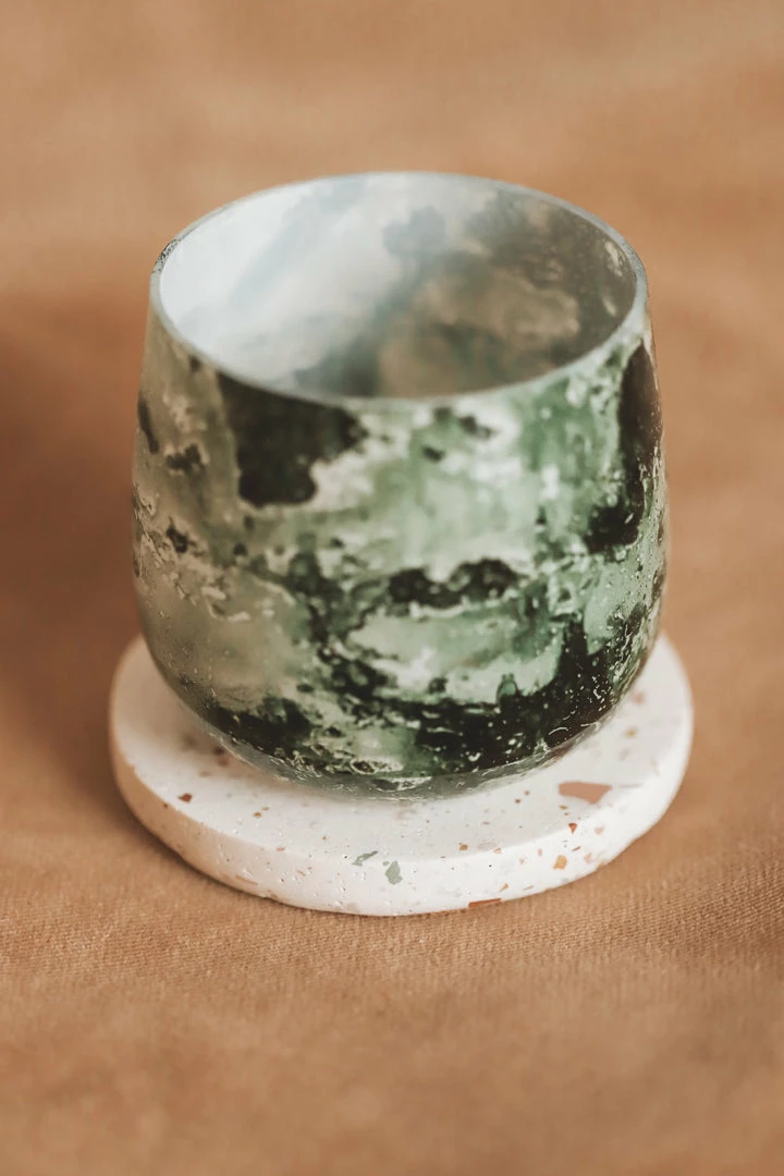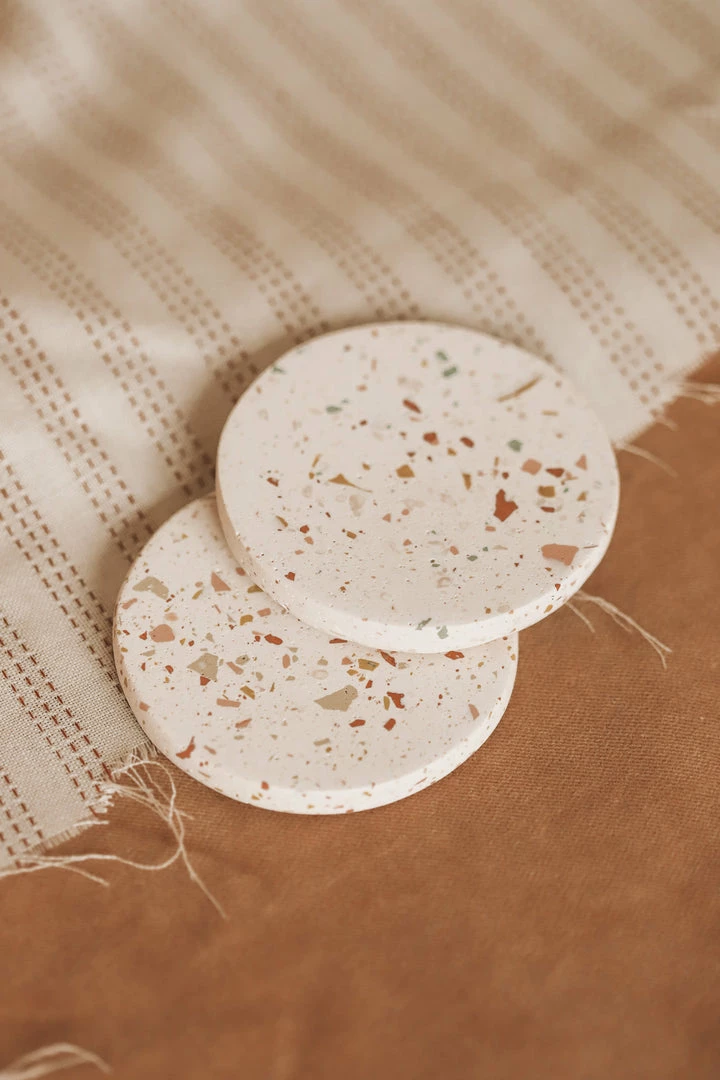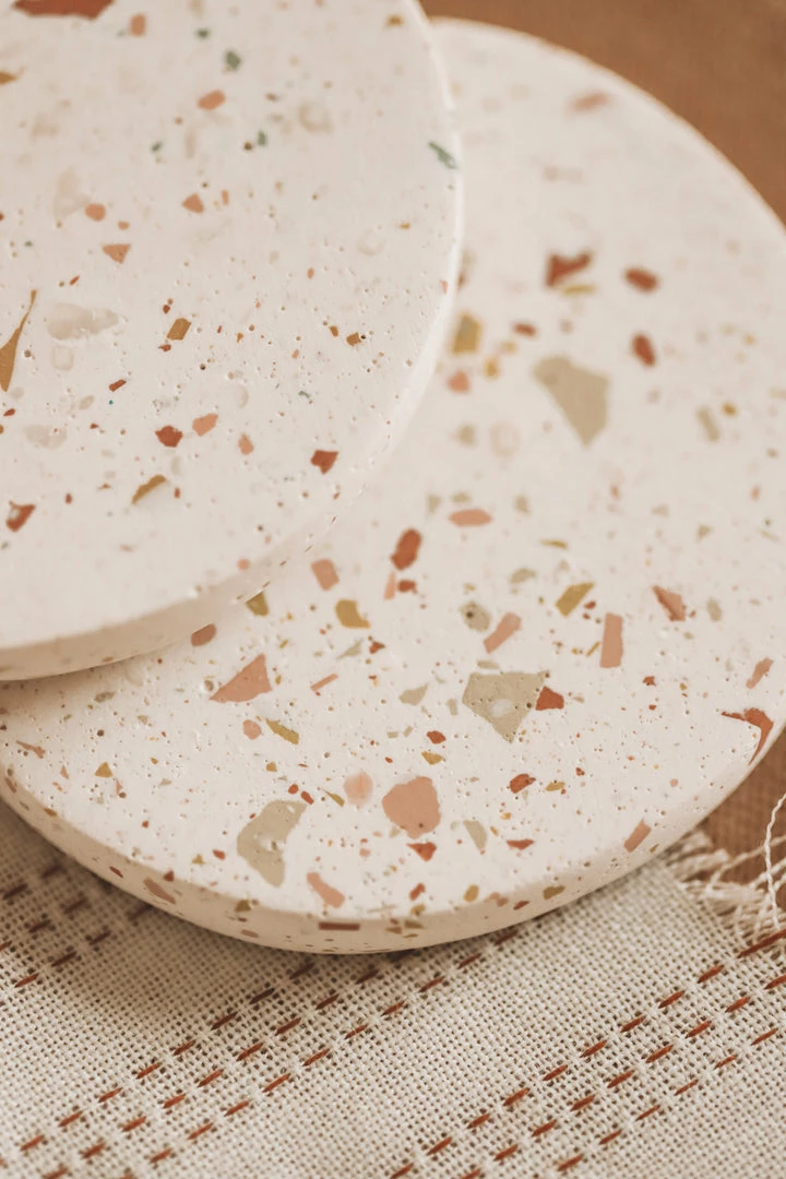 · jesmonite circle coasters with a white base and a natural terrazzo mix